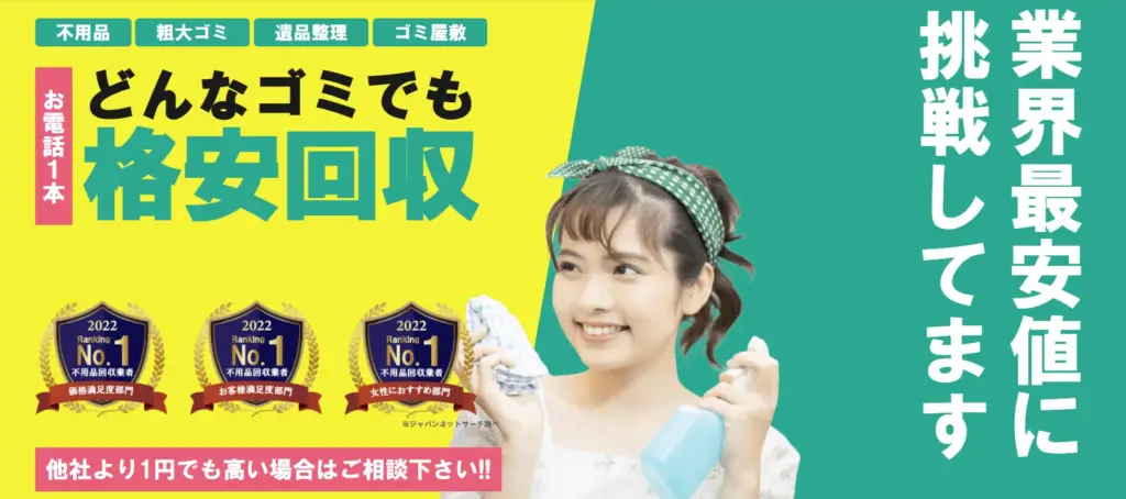| サービス内容 | 不用品回収、粗大ごみ回収、遺品整理、ゴミ屋敷片付け、ハウスクリーニング、不用品買取 |