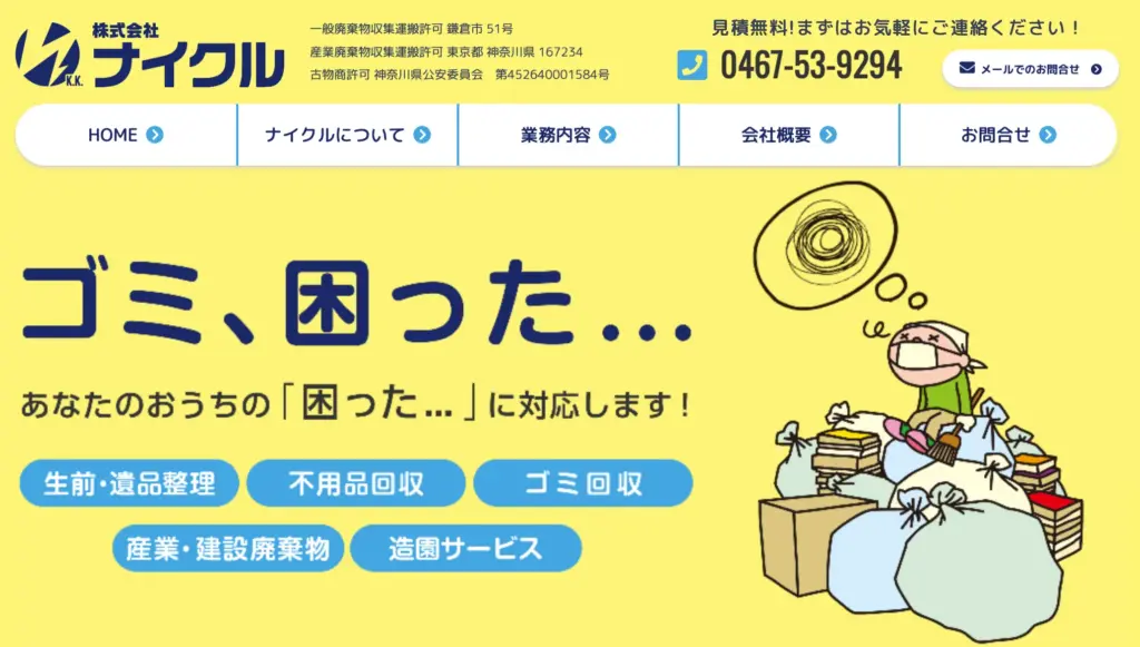 サービス内容不用品回収、粗大ごみ回収、遺品整理、ゴミ屋敷片付け、ハウスクリーニング、不用品買取