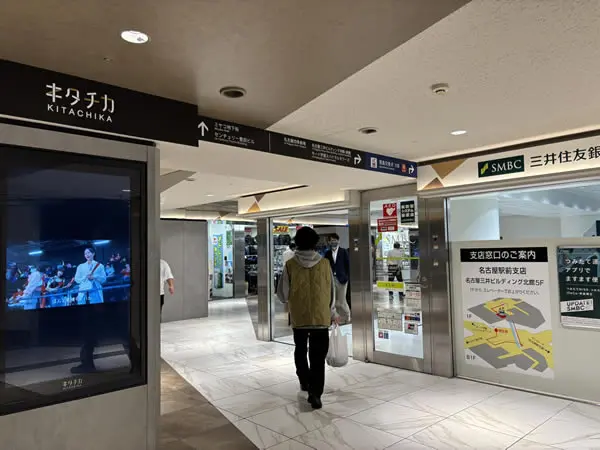 名古屋三井ビルディング北館(キタチカ)前を通り、三井住友銀行を右折します。マツモトキヨシを右手に階段を降ります。