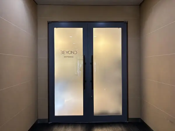 正面に「BEYOND名古屋駅前店」の入口が見えます。扉を引いてご来店ください。