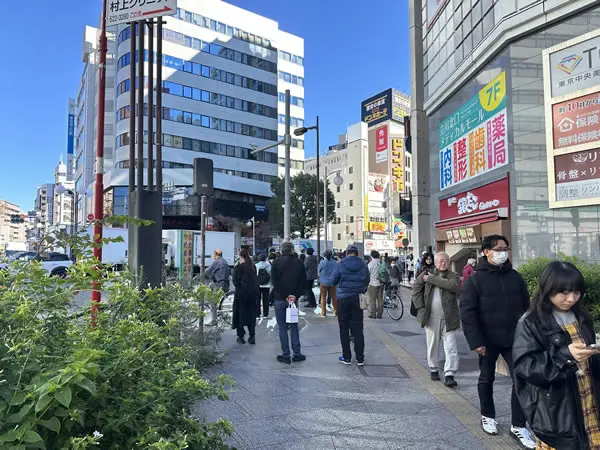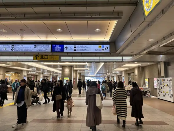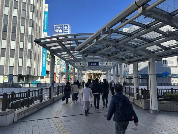 北口から出たら右手側の北口デッキを進みエレベーターを降ります。そのままビックカメラ沿いを直進します。